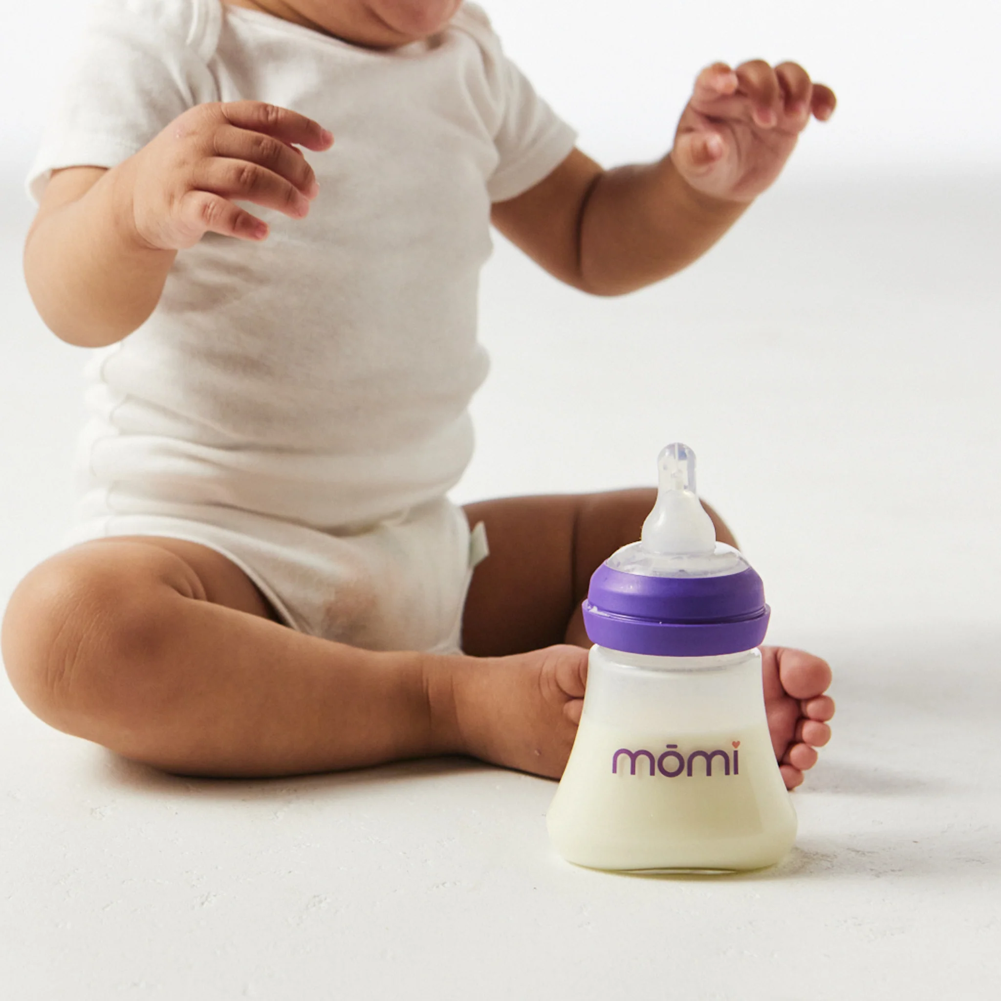 the perfect size for newborns and smaller feedings, mōmi's 5oz breast-like bottle was designed in collaboration with lactation professionals. available in purple or gray collars, these premium glass bottles feature babypace® technology that mimics breastfeeding, making transitions between breast and bottle seamless.