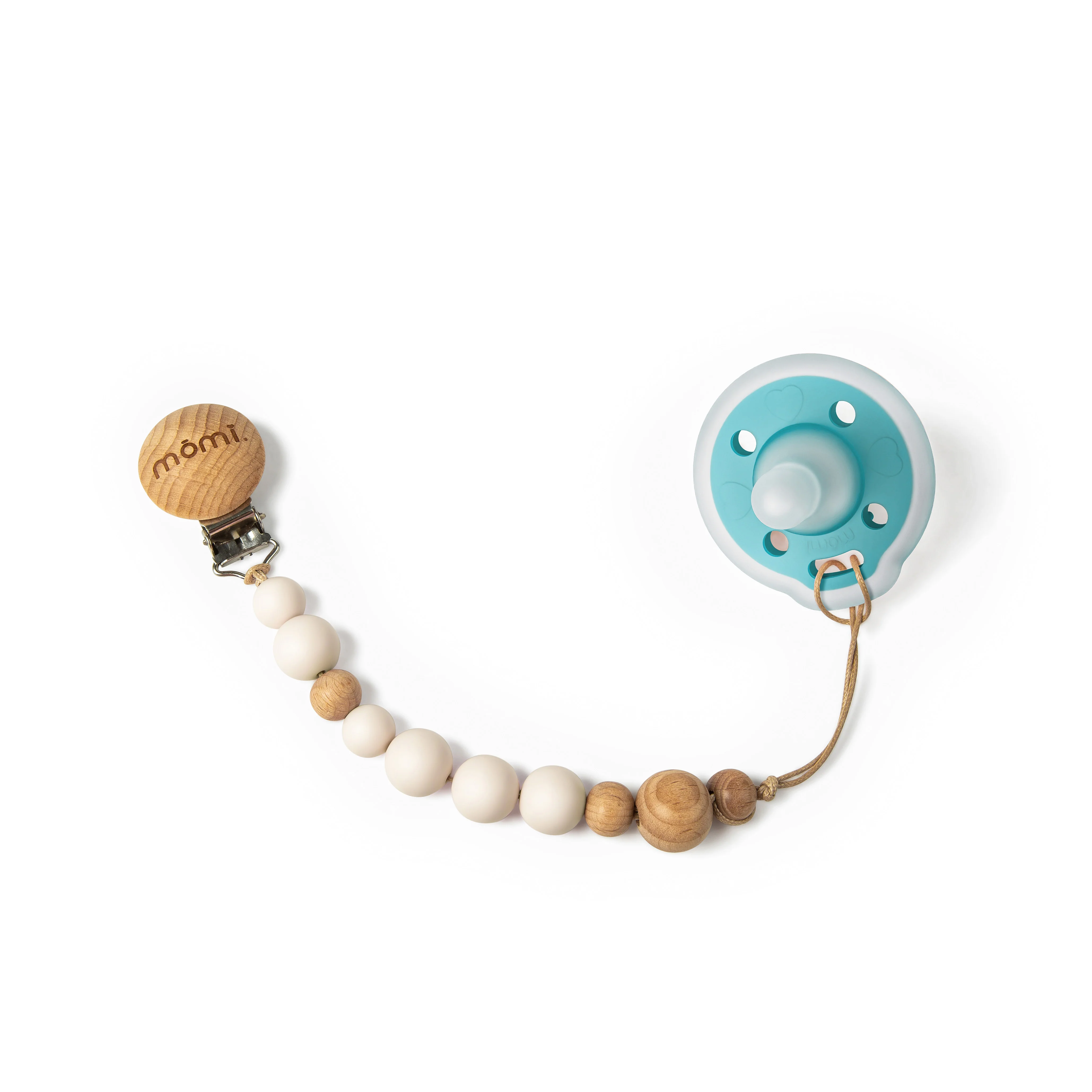 The set also features a babypace® pacifier, six interchangeable bottle collars, and a coordinating pacifier clip—all part of the mōmi vibes™ collection. The pacifier and collars are a crisp lagoon hue, while the clip is strung with soft pearl-colored silicone beads and natural wood accents. The lagoon vibe is a tranquil teal with a gentle energy—cool, balanced, and quietly bright. It’s a modern, refreshing palette that soothes and energizes all at once.